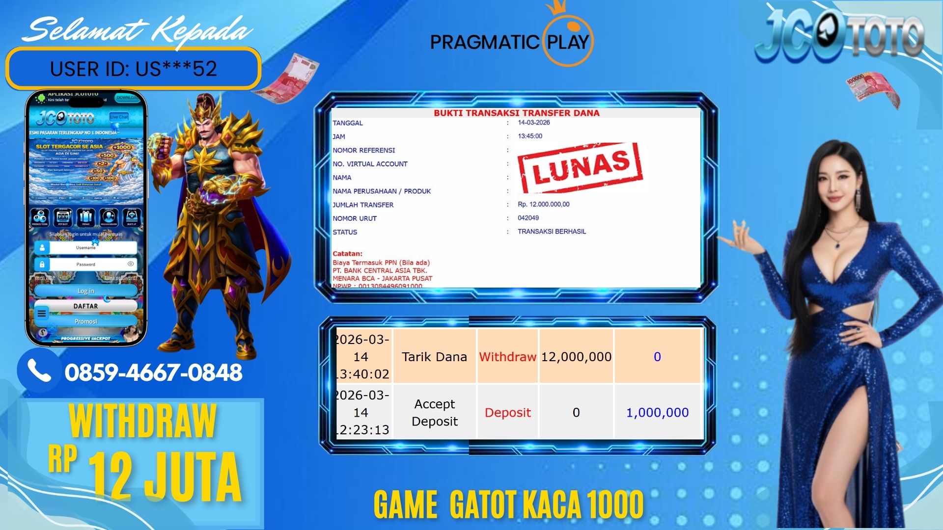 Selamat kepada us***52 yang akhirnya mendapatkan jackpot besar di permainan GATES OF GATOT KACA di situs bandar togel terpercaya JCOTOTO. Dalam WITHDRAW sebesar Rp. 12.000.000,- di bayar dengan lunas dalam 1 kali pembuatan form withdraw dan prosesnya di lakukan secara cepat oleh pihak JCOTOTO. Dengan bukti yang kami berikan sudah seharusnya menjadi hal yang bisa anda semua bayangkan betapa aman dan nyamannya pelayanan yang di berikan Jcototo kepada para membernya. Tentunya jika anda masih bingung mencari situs bandar togel dan slot online terpercaya, anda bisa segera melakukan pendaftaran dan bermain di situs togel dan slot online terpercaya dan terbukti membayar semua kemenangan jumlah berapapun sepertI situs Jcototo!